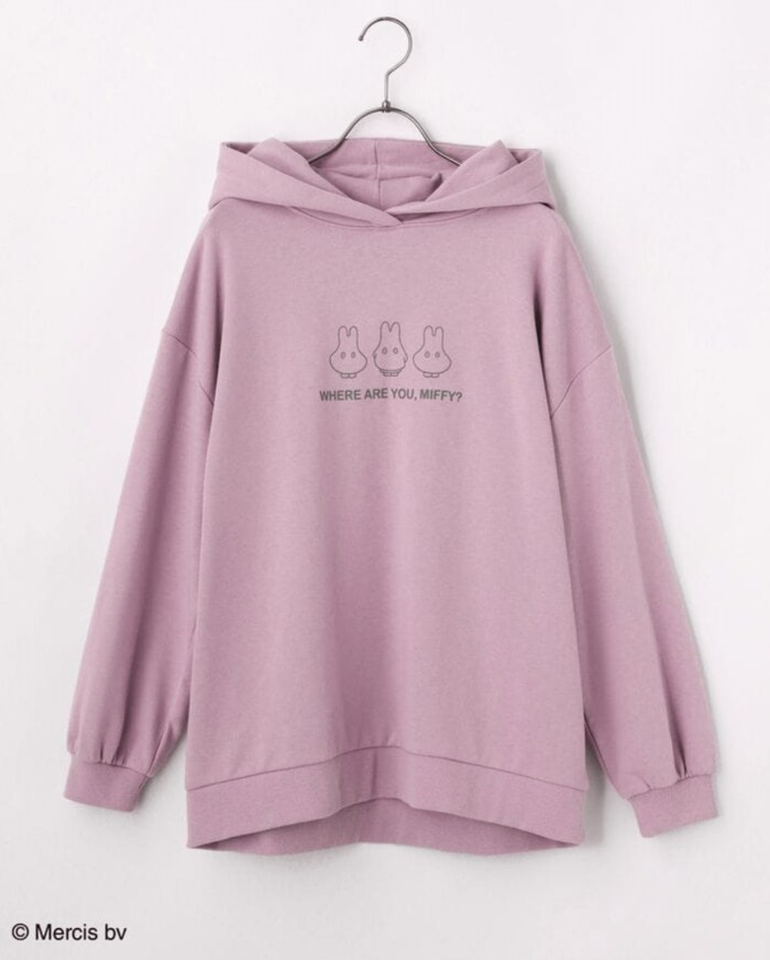 ミッフィーはカジュアルなパーカーともコラボしています。アイボリーとベージュにはミッフィーがたくさん描かれ、ラベンダーとスミクロには、おばけごっこしているおちゃめなミッフィーがプリントされています。やさしい肌触りのコットン入り裏毛素材で、着やすさ抜群。毎日のコーデからおうち時間まで、快適に着られるアイテムです。