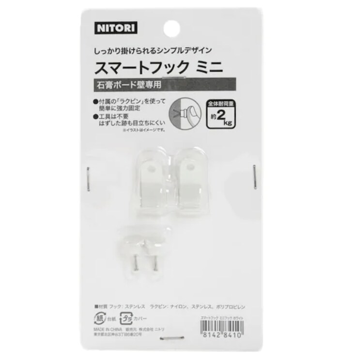 一般的な住居の壁は石膏ボードです。耐荷重がしっかりしたフックを設置するなら、石膏ボード専用のピンを使ったものがいいでしょう。ニトリなら、重たいものもかけられる便利なフックが見つけられます。