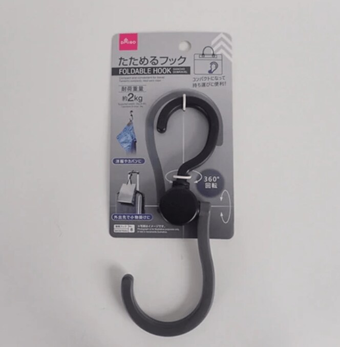 使うときだけ広げてものを掛けられる、たためるタイプの特殊フック。フックの根元が360度回転するため、好きな向きにできるのも便利なポイント。外出先で小物を掛けたり、ベビーカーに設置したりできるほか、買い物袋を車内に掛けておくなどさまざまな使い方ができます。