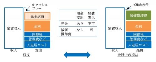 不動産の経費は少しややこしいですが、先ほど説明した通り、実際にお金が出ているのに経費に計上できないもの、実際にお金は払わないけれど経費に計上でき会計上の損益になるものが存在します。