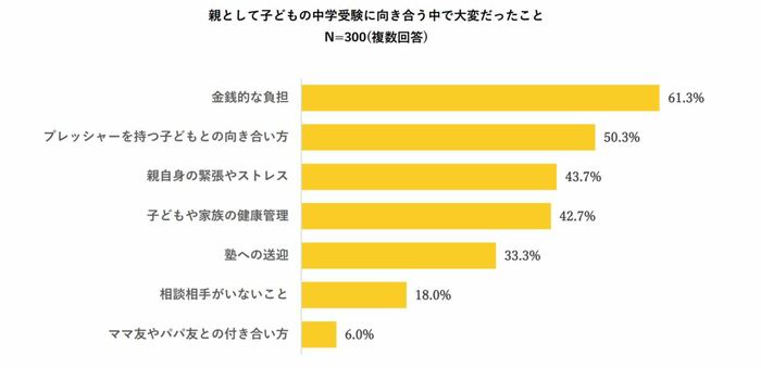 中学受験に向き合う中で大変だったことを聞いたところ、やはり「金銭的な負担」(61.3%)が最も回答が多く、次いで「プレッシャーをもつ子どもとの向き合い方」(50.3%)、「保護者自身のストレス」(43.7%)になりました。