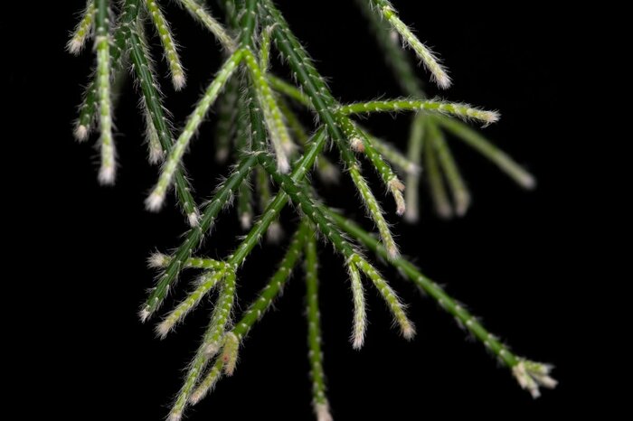 細かな毛に覆われた姿が、まるで粉をまぶしたようにも見えるリプサリス・ピロカルパ。柔らかな手触りを感じさせる姿で人気です。1~2月に白い花を咲かせます。