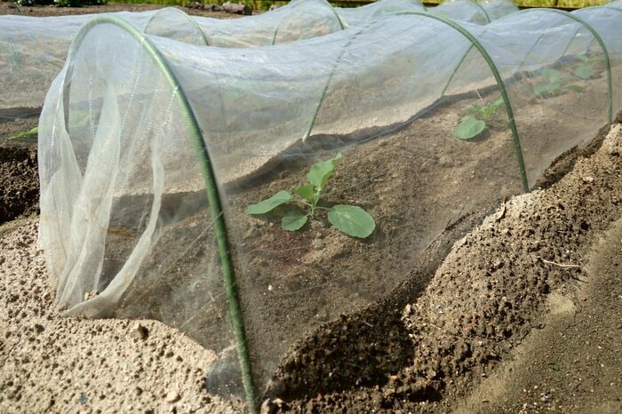 モンシロチョウが飛んできて葉に卵を産み付けないように、苗を植えたら虫除けネットをかけましょう。