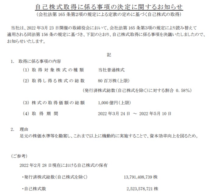 取得し得る株式の総数は80百万株(上限)、1,000億円(同)で、自己株式を除いた発行済株式総数に対する割合は0.58%です。