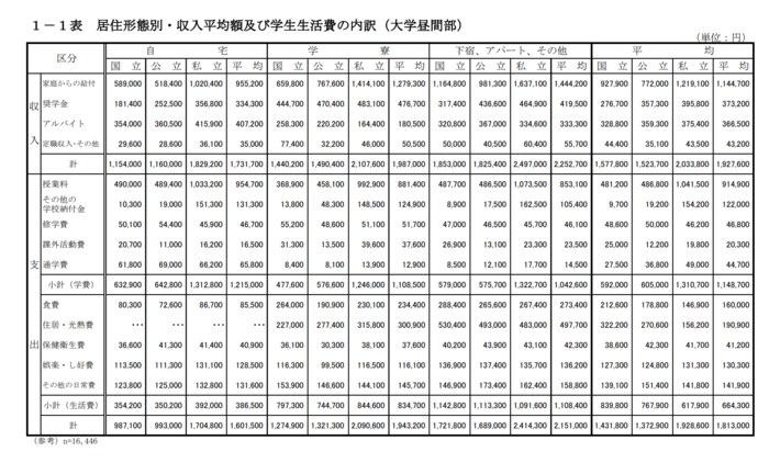 上記によると、国立と私立で学費かかる金額は以下の通り。「自宅」と「下宿、アパート、その他」の家庭にわけて見ていきます。