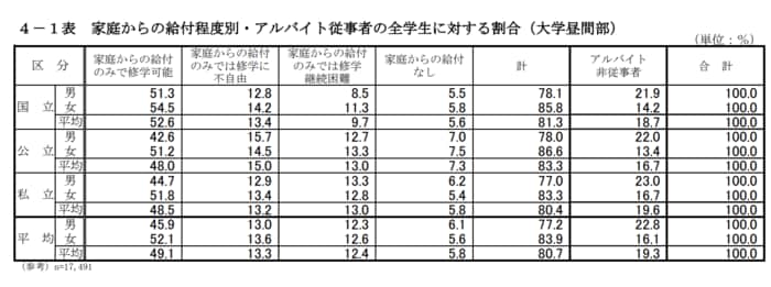 上記によると、アルバイトをしている学生は約8割ほど。そのうち「家庭からの給付のみで修学可能」なのは国立・私立ともにおよそ半分ほどです。
