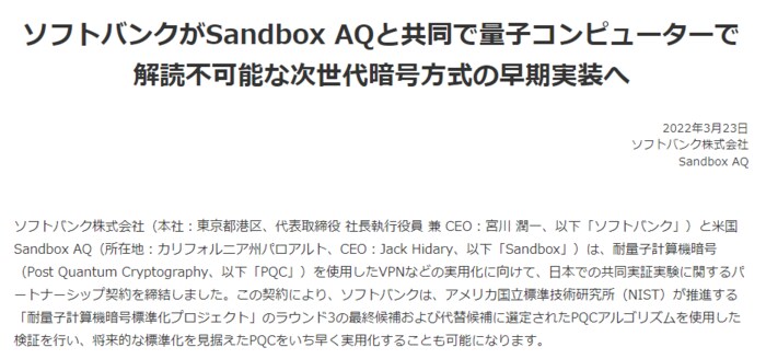 ソフトバンクは2022年3月23日、米Sandbox AQと、耐量子計算機暗号(Post Quantum Cryptography、以下「PQC」)を使用したVPNなどの実用化に向けて、日本での共同実証実験に関するパートナーシップ契約を締結したと発表しました。