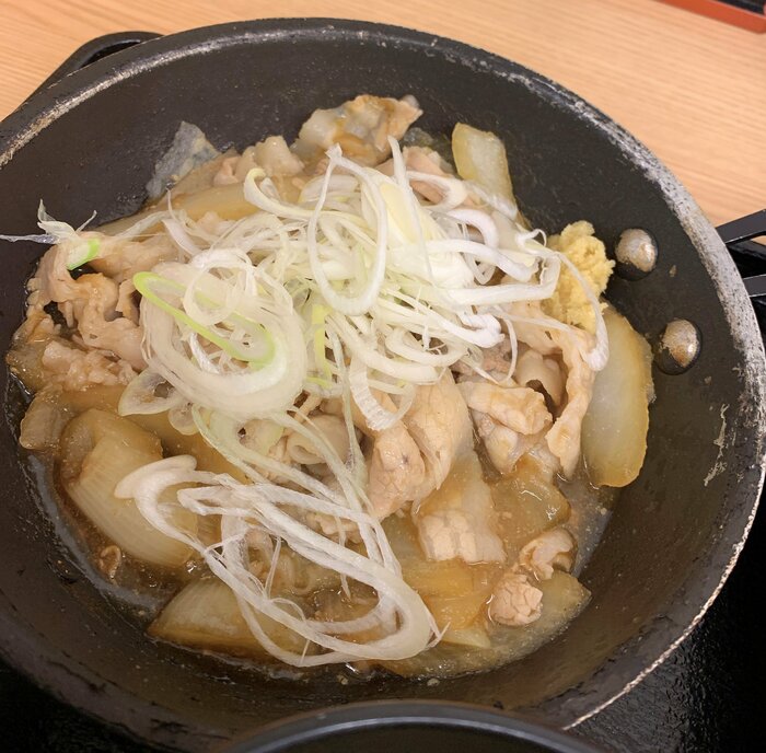 牛皿はいつも通りつゆだくで注文。豚生姜焼きは熱々のスキレットの上で湯気を立てています。到着した瞬間から生姜の良い匂いがふわっと香ってきます。それもそのはず、特製たれとトッピングの両方に生姜が使われているんです。