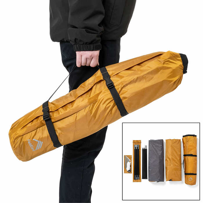 ・サイズ:(設営時)本体 長さ215×幅104×高さ98cm、出入口 幅92×65cm、出入口前の空間 30cm、ドア部 長さ101×幅105×高さ86cm(収納時)直径13×長さ55cm