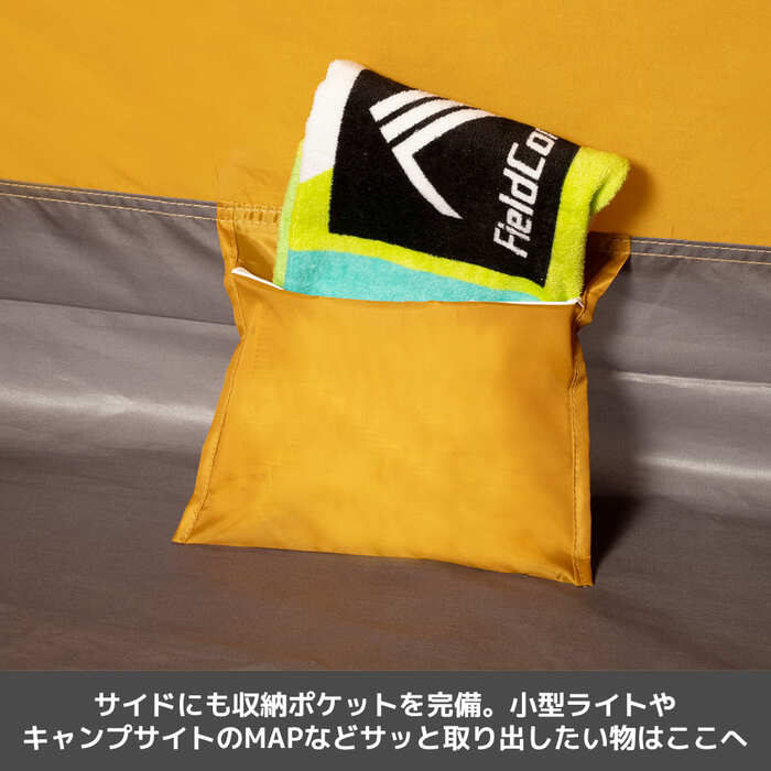 天井収納メッシュシート付きで、シートにはフックを通せる穴付きでランタンを吊るしながら収納スペースも確保できます。小物を入れておくのに便利なサイド収納ポケットも付いたり、コンパクトになる付属の収納袋を使えば持ち手付きで持ち運びもラクラクですね。こちらはWEB限定アイテムです。