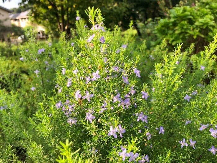 ローズマリーの葉姿に似ていることからオーストラリアンローズマリーとも呼ばれていますが、香りはありません。枝がまっすぐ伸びるので、こんもりと美しい樹形を保ちやすく、アクセントとしてもオススメ。日当たりと風通しのよい場所に植えましょう。