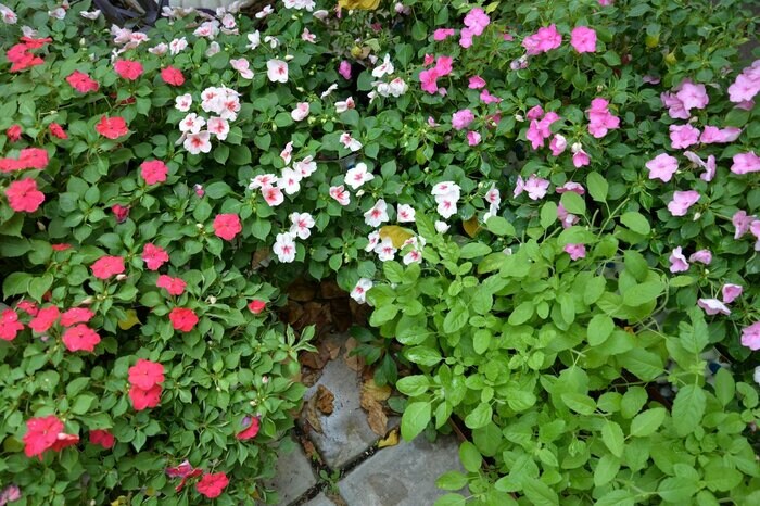 春の終わり頃から晩秋まで楽しめる花、インパチェンス。一重咲きや八重咲き、バラ咲きなどさまざまな品種があり、いずれもカラフルな花を咲かせます。