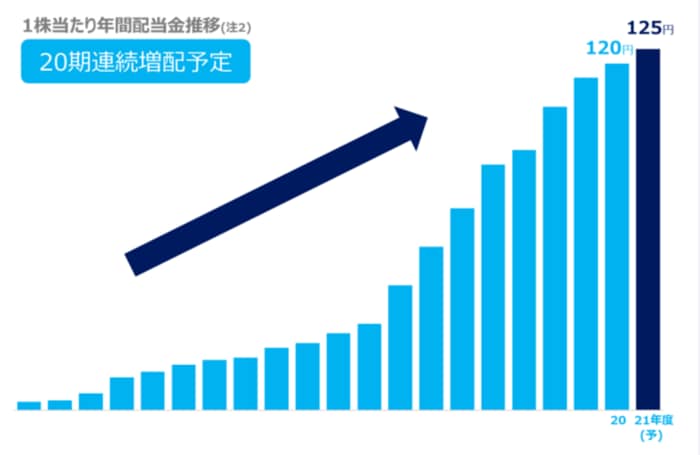 2020年3月期の期末配当と、2021年3月期の中間・期末配当、2022年3月期の中間配当の計4回受け取ることができます。