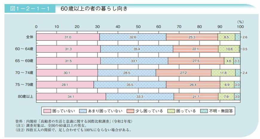 内閣府の「令和3年版高齢社会白書」によると、経済的に困ると回答したシニアは「70~74歳」が最多でした。