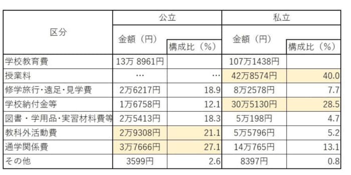 一方の公立中学では、教科外活動費2万9308円(21.1%)と通学関係費3万7666円(27.1%)で、学校教育費の半分ほどになっています。