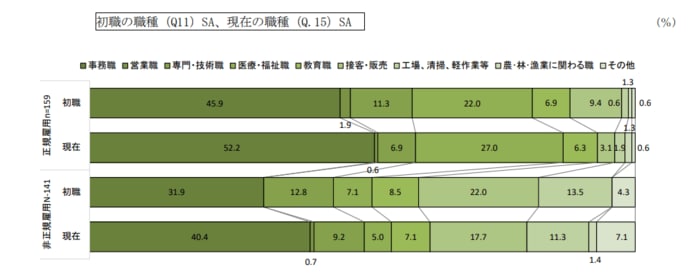 正規では初職、現在の職業ともに最も多いのが「事務職」で現在は52.2%。次に多いのが「医療・福祉職」で、現在は27.0%でした。
