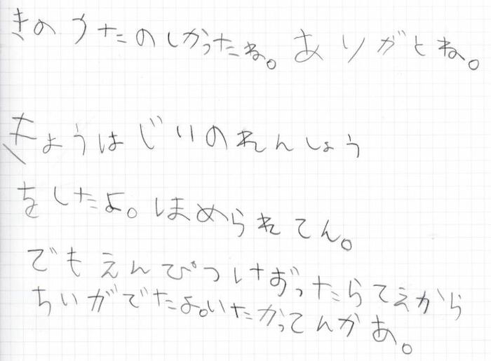 以下は、知り合いの子ども(関西ネイティブ)がお手紙に書いてくれた文章です。
