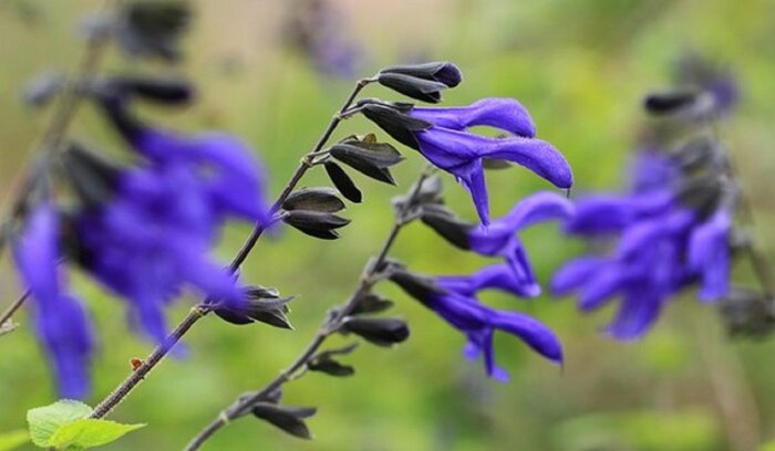 長く伸びた細い枝に青紫の花を穂状にさかせるメドーセージ。深みのある色合いとナチュラルな花姿が人気の多年草です。