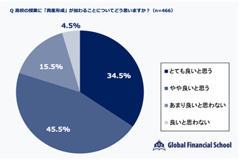 実際、現場の先生達からも金融教育への期待が高まっているようです。金融オンラインスクール「グローバルファイナンシャルスクール」が金融教育に関するアンケートを全国の20〜50代の高校教師466名に実施。家庭科で資産形成が必修となったことに対し、8割の教員が「とても良いと思う」「やや良いと思う」と回答しました。