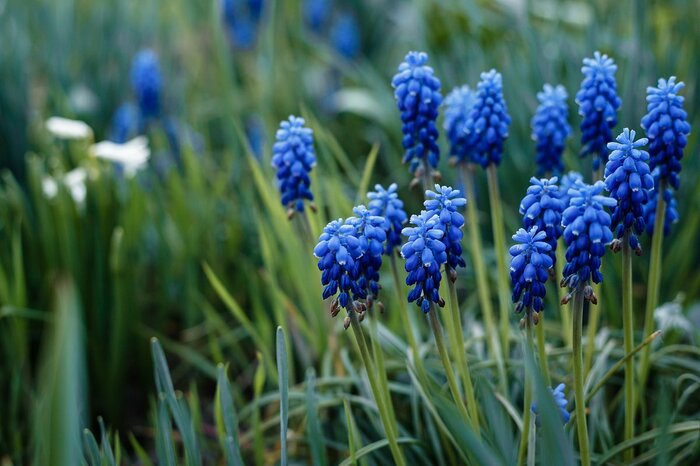 青や白のブドウのような球状花を咲かせる可愛らしい花、ムスカリ。秋に球根を植えて育てるのが一般的ですが、早春~春に出回る芽出しポットの苗であれば春に植えることが可能です。