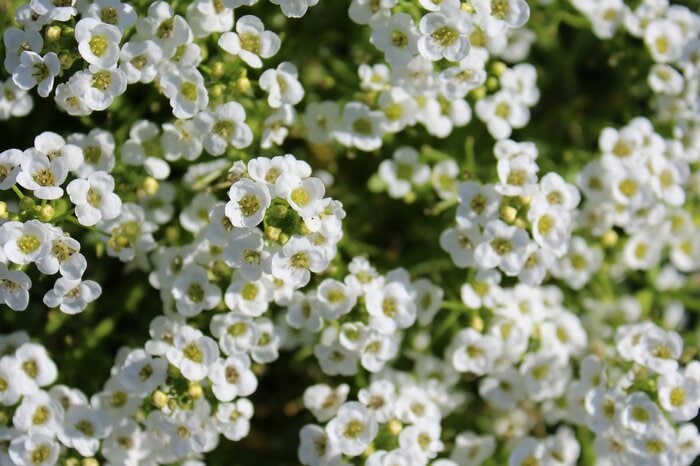 白い小さな花が集まり、ひとつの花房を作るスーパーアリッサム。春と秋が開花の全盛期ですが、日当たりと風通しがよい場所であれば、夏と冬も花を咲かせることがあります。