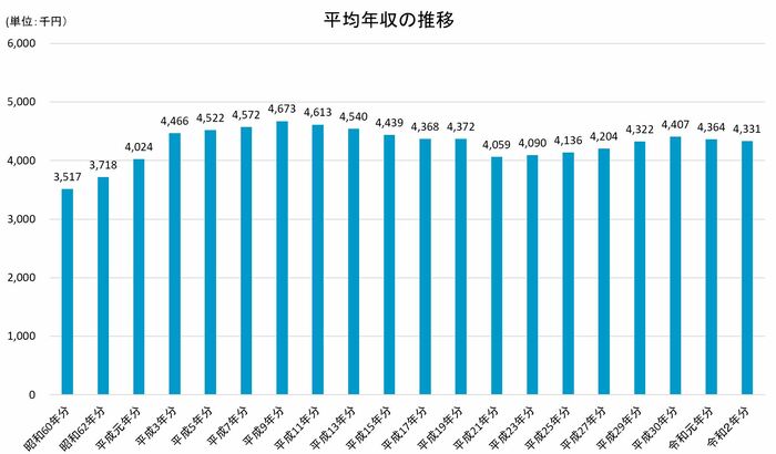 平成9年に467.3万円になったのをピークに徐々に下がっていき、平成21年には405.9万円まで落ち込んでいます。これはリーマンショックの影響と思われます。