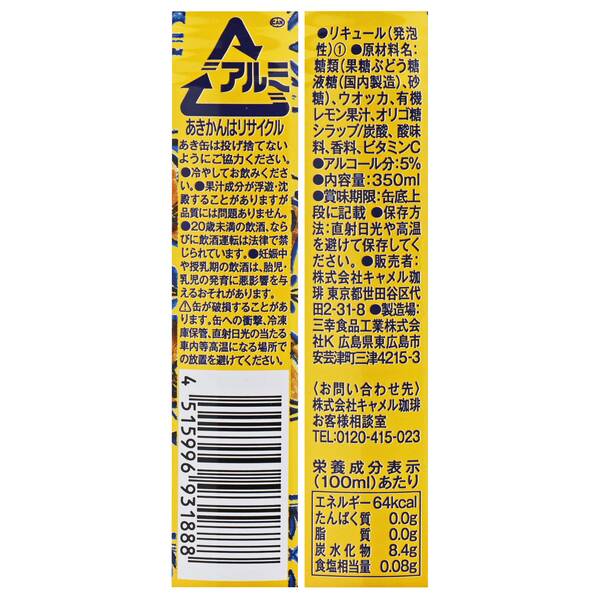 ・原材料:糖類(果糖ぶどう糖液糖(国内製造)、砂糖)、ウオッカ、有機レモン果汁、オリゴ糖シラップ/炭酸、酸味料、香料、ビタミンC