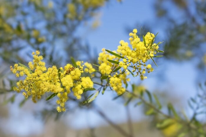 葉の形の違いなどで様々な品種があるアカシアの木は、春先に黄色いポンポンの花を咲かせる樹木。