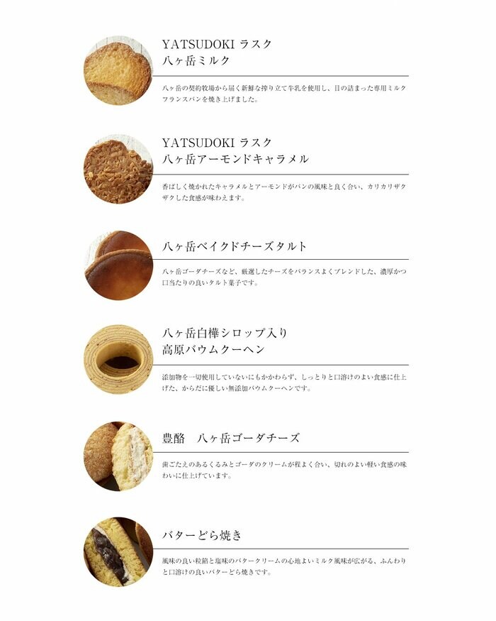 ・内容:YATSUDOKI ラスク 八ヶ岳ミルク×4個、YATSUDOKI ラスク 八ヶ岳アーモンドキャラメル×4個、YATSUDOKI 八ヶ岳ベイクドチーズタルト×4個、YATSUDOKI 八ヶ岳白樺シロップ入り高原バウムクーヘン×4個、YATSUDOKI 豊酪 八ヶ岳ゴーダチーズ×4個、YATSUDOKI バターどら焼き×4個