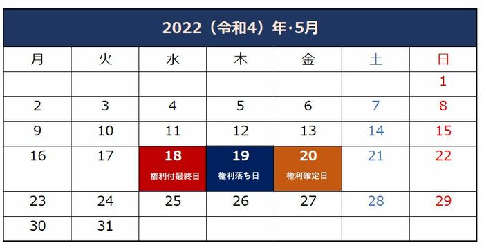 たとえば、5月20日が通期決算の会社であれば、本決算の権利確定日と権利付最終日は以下のようになります。