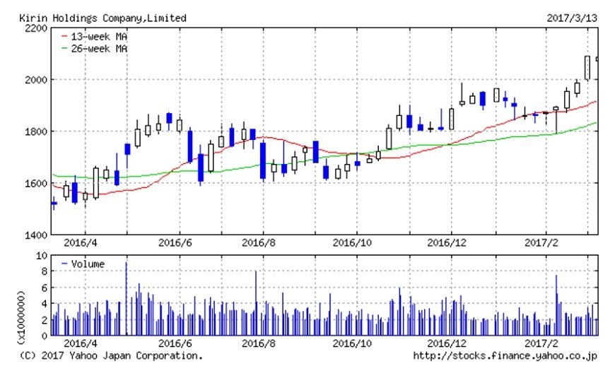 キリンホールディングスの株価が高値更新