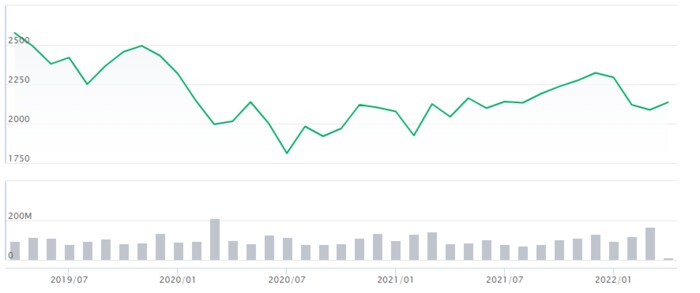 足元ではいくらか持ち直し、2022年4月4日の終値で2136円でした。