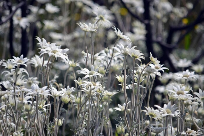 白くてフワフワした花がフランネルの生地を思わせるフランネルフラワー。シルバーグリーンの葉は常緑で、葉も毛でおおわれています。多年草ですが多湿が苦手。日本では一年草として扱われています。