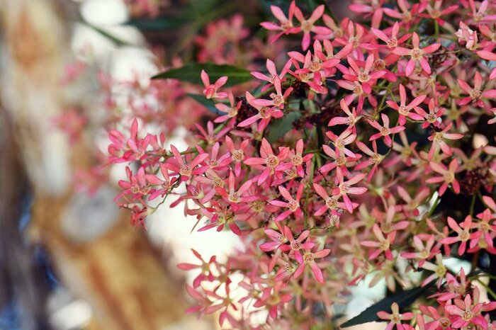 クリスマスブッシュは白い小花が咲き進むとガクが赤く色づくのが特徴。南半球のオーストラリアではクリスマスに当たる6月頃に木が真っ赤になります。濃厚な香りと味わいの蜂蜜が採れることでも知られています。
