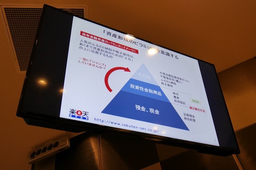 第一部「お金についてやさしく教わらナイト」に登場した楽天証券経済研究所の篠田尚子氏は、資産形成成功の秘訣は「資産形成のピラミッドを意識する」ことだと指摘。株主優待やふるさと納税は資産形成の土台、すなわち現金や預金(+株、債券、投資信託)の最上部に成り立つものであり、いきなりのジャンプアップは禁物だとズバリ。