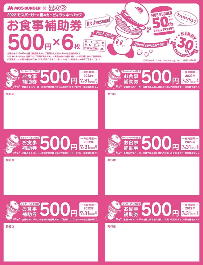 ・セット内容:コットントートバッグ、ボトルホルダー、ジッパーバッグ、星のカービィサンドイッチ抜き型、お食事補助券3000円相当(500円×6枚綴り)カービィデザイン専用袋(※お食事補助券の有効期限は2022年7月末まで)