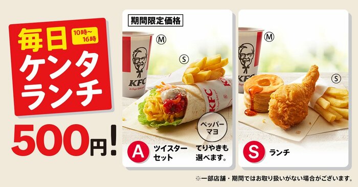 定番の「ランチS」は、KFCの王道「オリジナルチキン」「ビスケット」「ポテト」が全部楽しむことができて税込500円。「ツイスターセット」は、トマトベースのサルサソースでピリ辛な「ペッパーマヨツイスター」か、特製てりやきソースで甘辛の「てりやきツイスター」から選ぶことができます。通常は税込550円のところ、今だけの期間限定、税込500円で味わえるというお得な企画です。