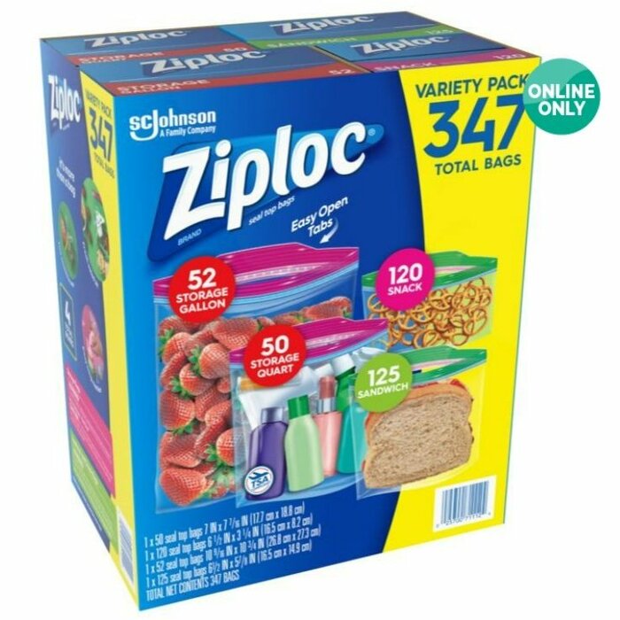 4種類の保存袋がたっぷり347袋も入った、オンライン限定で購入できるジップロックのアソート商品。端から端までしっかり締まるのに、サッとつまんで開封できる、「イージーオープンタグ」と呼ばれる構造になっているのが特徴です。保存袋はサイズ違いになっているので、入れるものの大きさや保管場所の空きスペースに合わせて、使い分けができるのもいいですね。