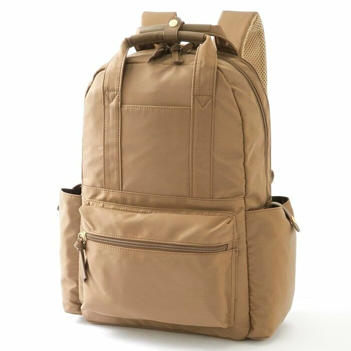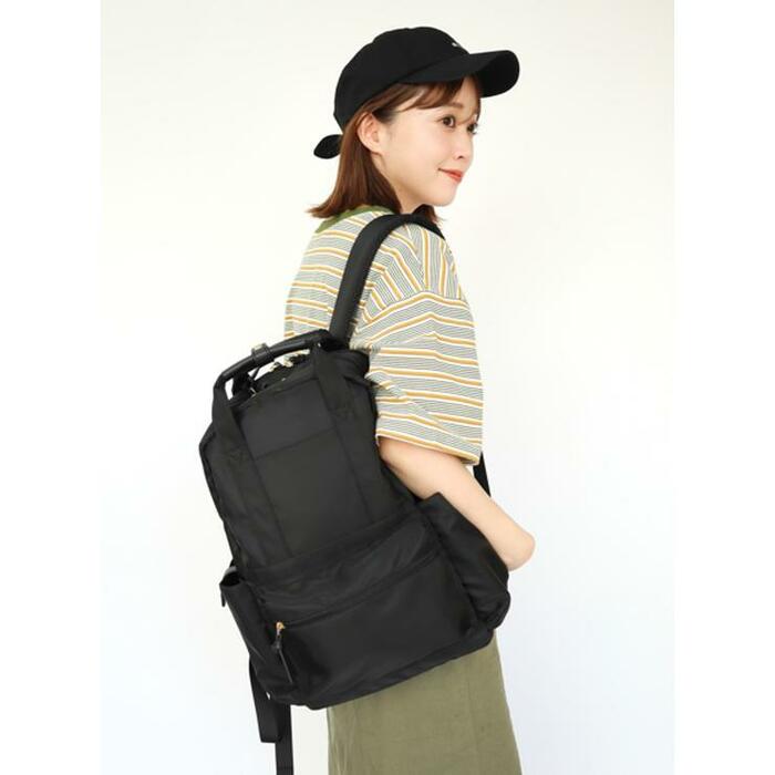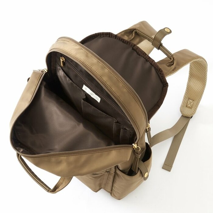 また、背面にはファスナーポケットもあり、背負ったままよく使う物など出し入れする事が可能です。荷物もたくさん入るので、ママさんたちにもおすすめのアイテムですね。