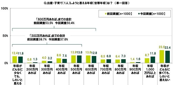 出産・子育て(1人)しようと思える世帯年収額を聞いた結果も確認しましょう。