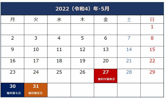 ただし、2022年の場合は、5月29日が日曜日となるため、権利付最終日は5月27日(金)となります。