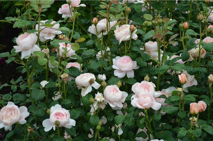 ソフトなベビーピンクの花が愛らしいオリビア・ローズ・オースチン。咲き始めはカップ咲きで、開くにつれてみごとなロゼット型に変化します。よく返り咲きし、耐病性の高い品種です。