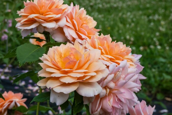 先端が少しとがった花弁が重なり合い、優美な香りと花姿のグレイス。やわらかなオレンジ色でやや小ぶりの花が繰り返し咲きます。中程度の高さでこんもりとした樹形になり、メインの足元に置くバラとしてオススメです。