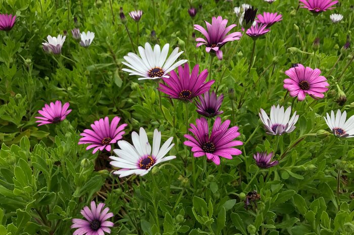 フレンチラベンダーと比べ、株の高さも形も違うオステオスペルマム。オステオスペルマムは花色や形も非常にバラエティ豊かなので、合わせ方によって様々な印象の寄せ植えができるでしょう。