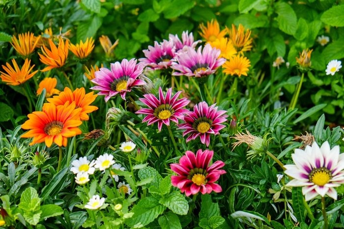 別名「勲章菊(くんしょうぎく)」とも呼ばれるガザニア。名前のとおり、春から秋にかけて勲章のような花を咲かせます。草丈は約30センチほど。濃い黄色やオレンジ、ピンクなどパッと目を引く鮮やかな花色が多いのも特徴です。