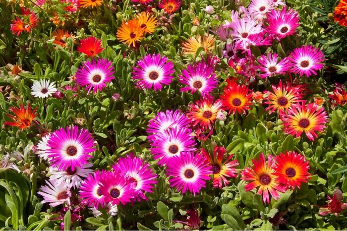 上に開いた蛇の目傘のような花姿が人気のリビングストンデージー。赤やピンク、オレンジなど鮮やかな花色が多く、単色からグラデーションまで豊富な花色がそろっています。