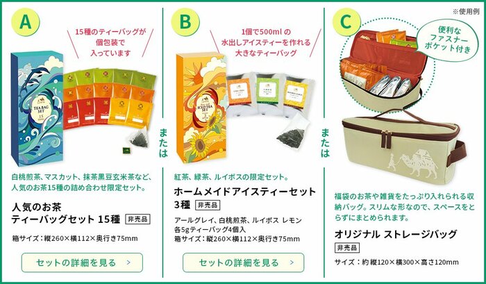 ・限定品:(A)人気のお茶ティーバッグセット15種、(B)ホームメイドアイスティーセット3種(各ティーパック4個入り)、(C)オリジナルストレージバッグ