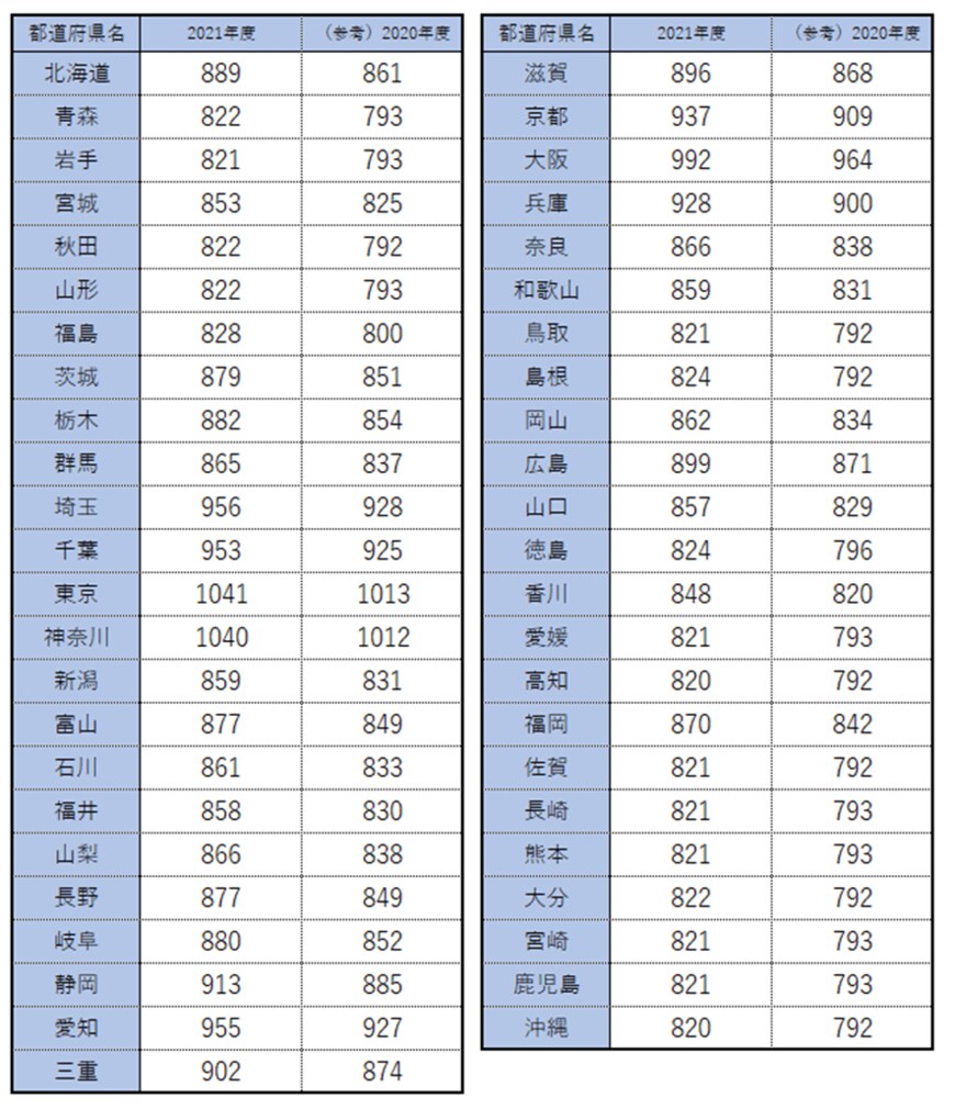 また東京都でも2020年度の1013円に比べて28円の増加です。どの地域でも28円~32円増加していることを踏まえると、労働者全体の賃金の底上げが図られていることはわかります。