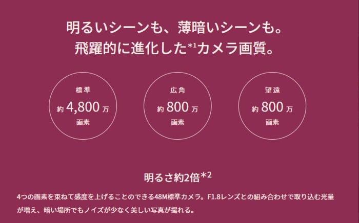 トリプルカメラを搭載しており、標準カメラ約4800万画素、広角カメラ約800万画素、望遠カメラ約800万画素となっています。