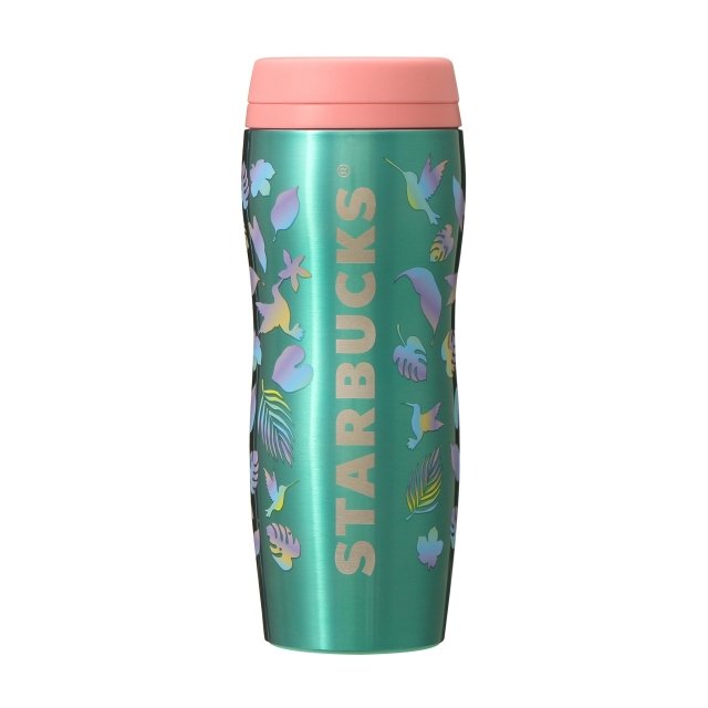 夏らしいモチーフをホログラムでデザインしたステンレスボトルです。鮮やかなグリーンのボディに、七色に見えるホログラムでハミングバードや夏らしい植物をデザインしています。光にあたるとさりげなく輝く、華やかな印象が特徴です。